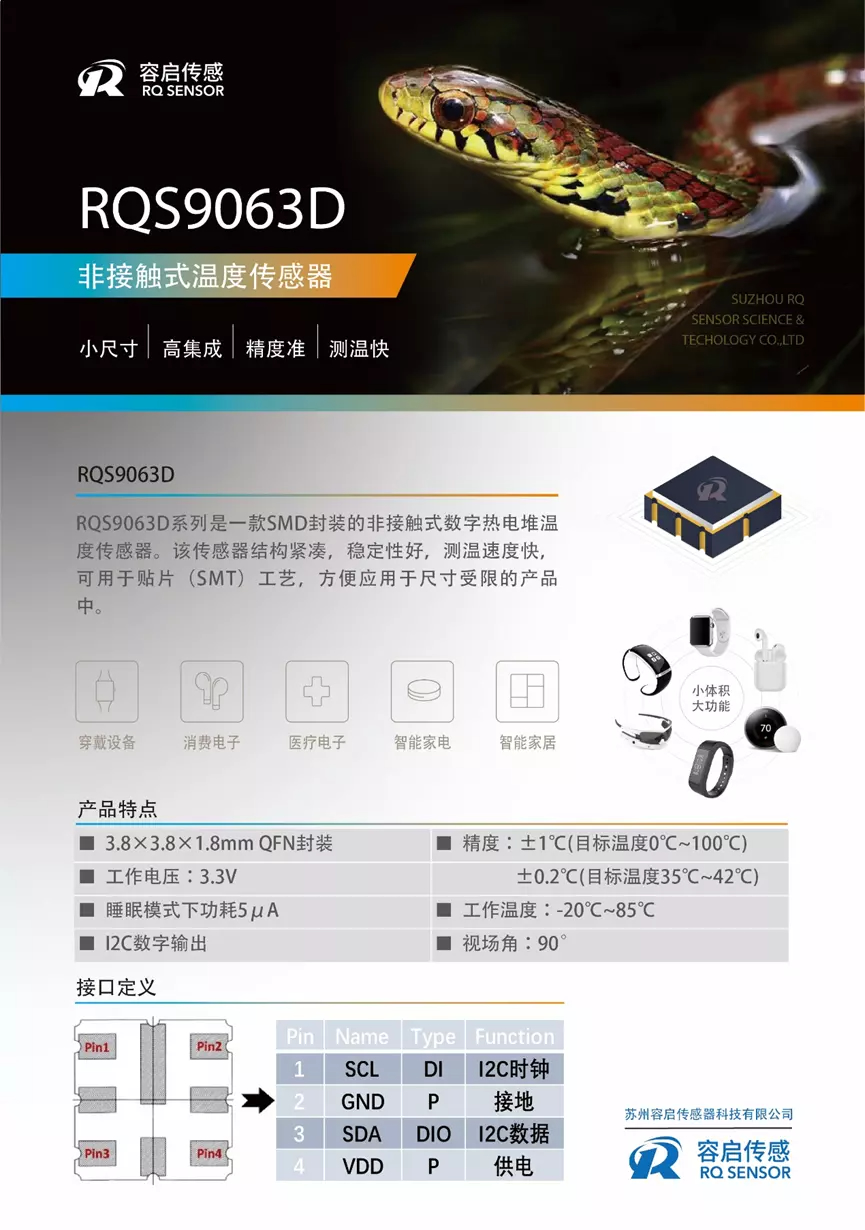 RQS9063D系列非接触式数字热电堆温度传感器,包括一个红外传感器(热电堆)和一个内建的传感器信号调理芯片,可以通过I2C接口连接到任何微控制器,这个微控制器可以方便获取ADC值和校准参数来计算温度结果。